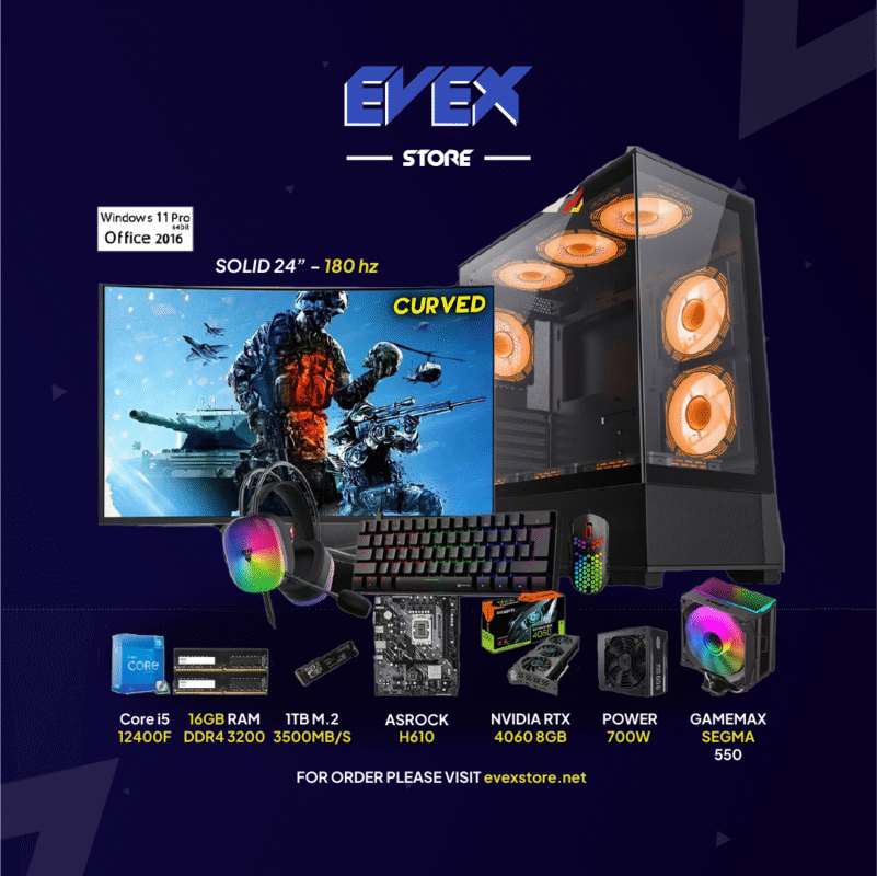 Evex Elite Gaming PC – Core i5 12400F | RTX 4060 8GB | 16GB RAM | 24″ Curved 180Hz Monitor