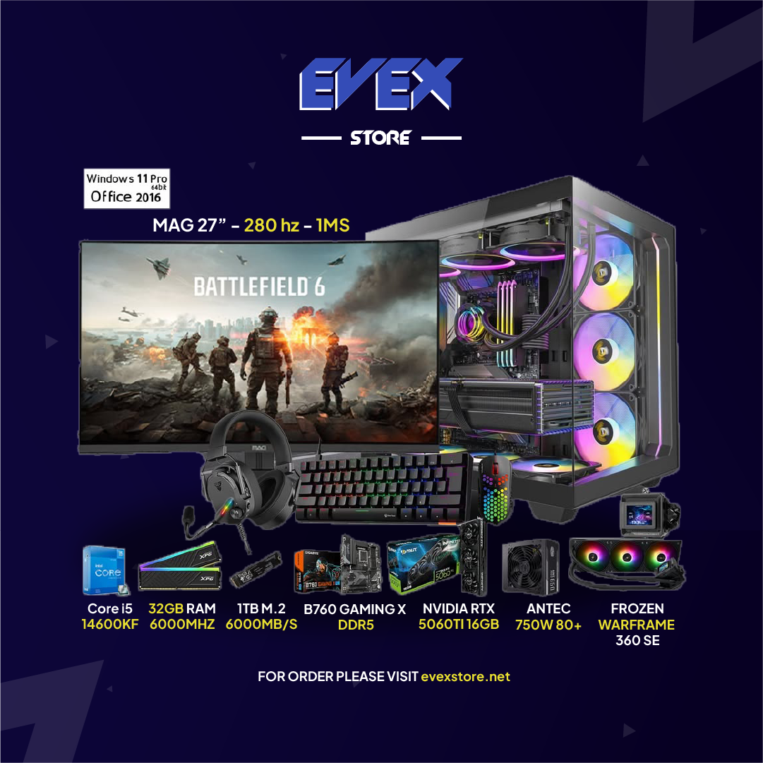 Evex Pro Gaming PC – Core i5 14600KF | RTX 5060Ti | 32GB RAM | 27″ 280Hz Monitor