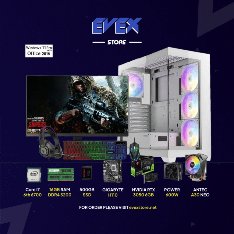 Evex Gaming PC – Core i7 6700 | RTX 3050 6GB | 16GB RAM | 24″ Monitor