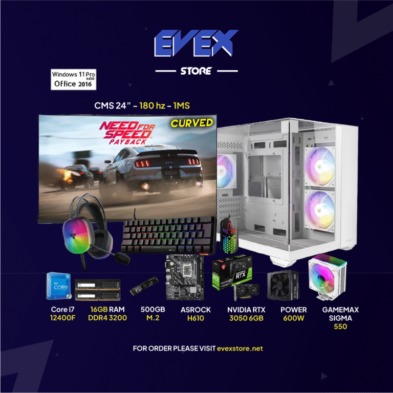 Evex Gaming PC – Core i7 12400F | RTX 3050 6GB | 16GB RAM | 24″ Curved 180Hz Monitor
