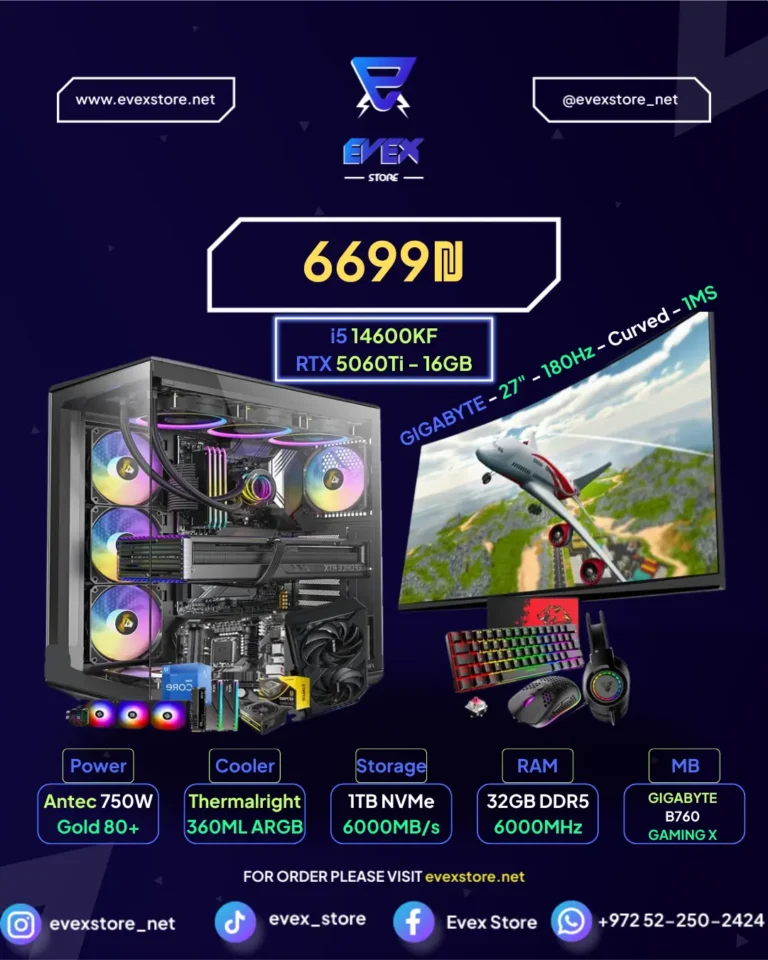 Evex Gaming PC – Intel i5 14600KF | RTX 5060Ti 16GB | 32GB RAM | 27″ Curved 180Hz Monitor