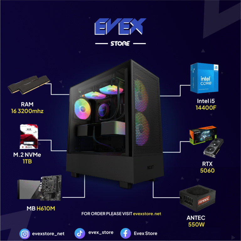 Evex Gaming PC – RTX 5060 – i5 14400F – Solid 27″ 180Hz